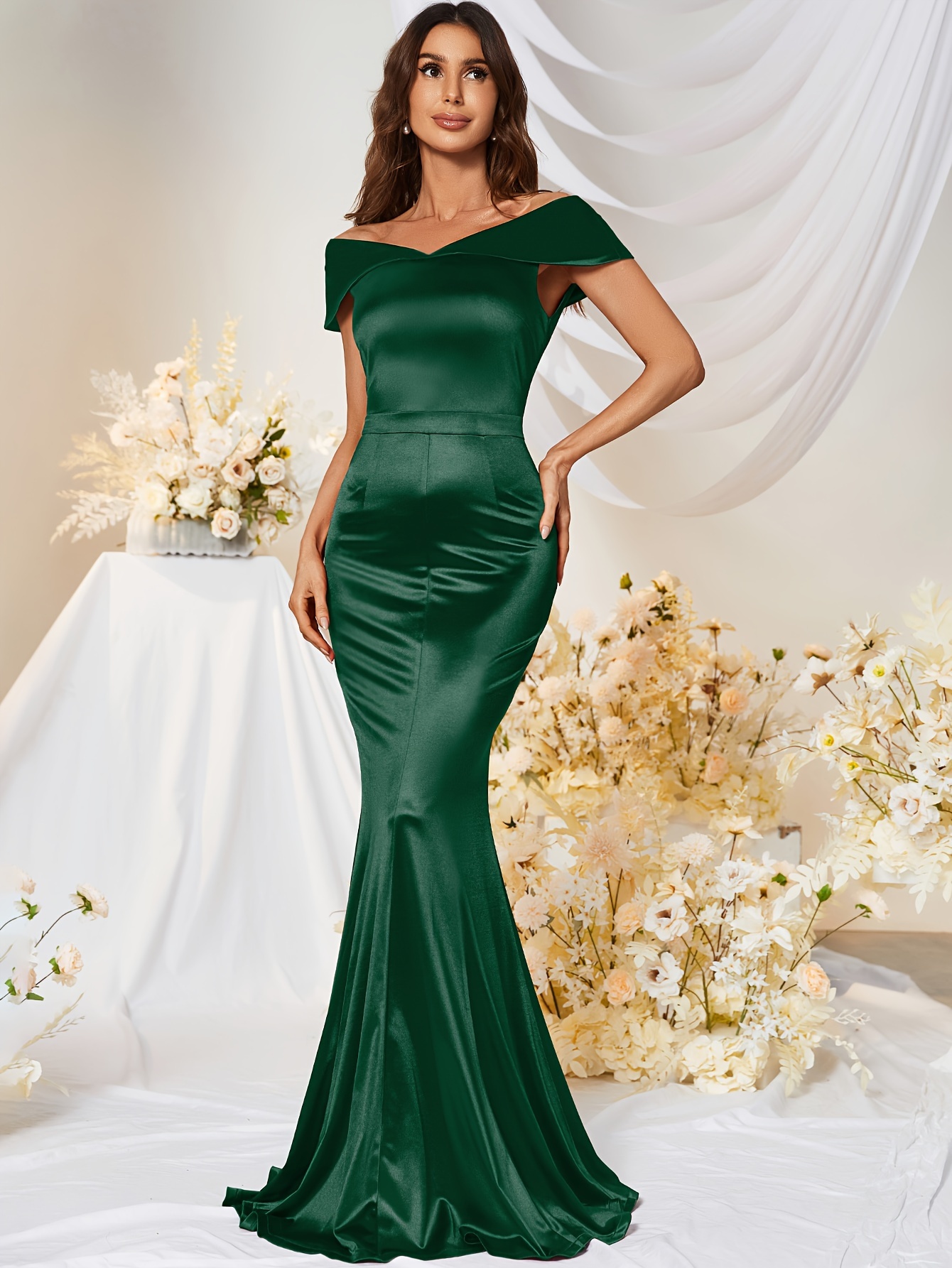 1pc MUXXN Elegant Satin Mermaid Gown for Women - Off the Shoulder Cap Sleeve Bodycon Floor-Length Dress, Solid Color Knit Fabric, All-Season Bodycon for Wedding Bridesmaid