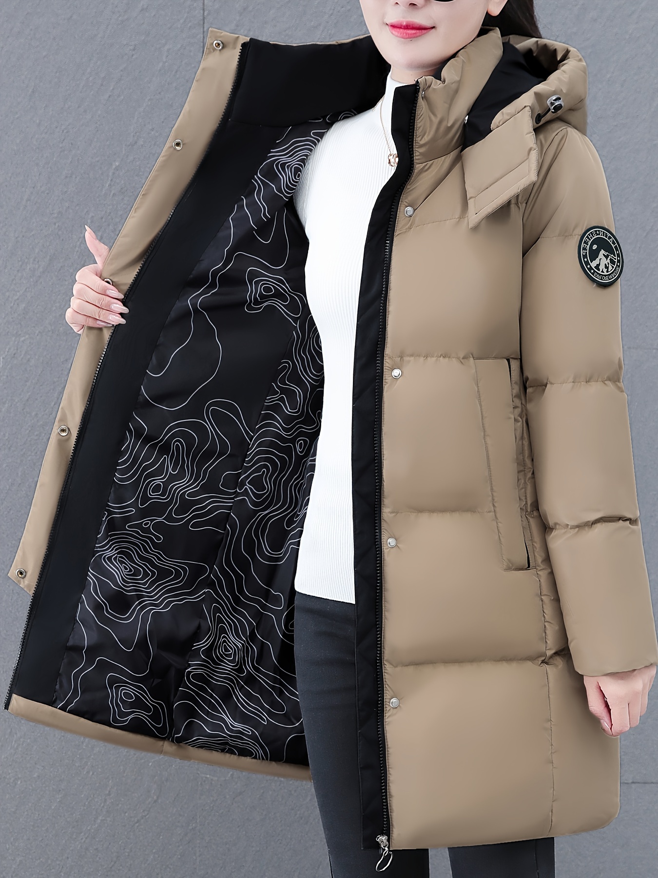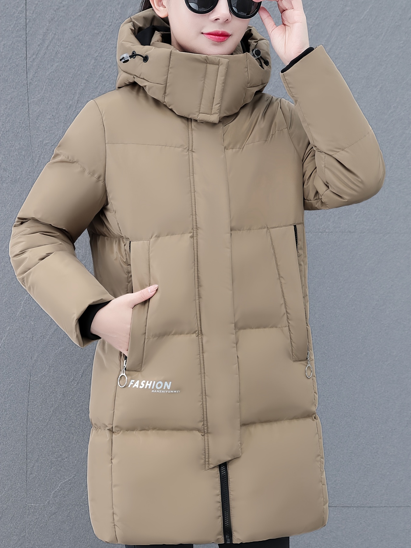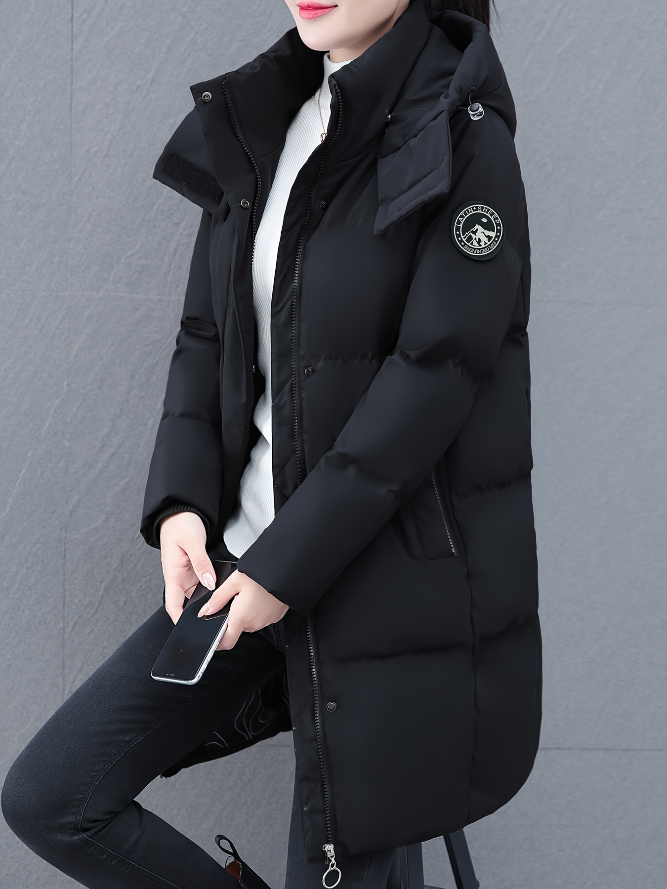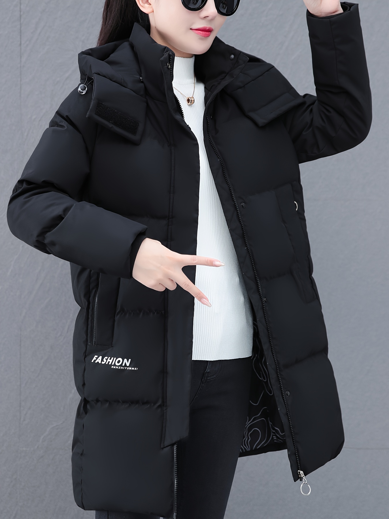 Elegant Plus Size Long Length Hooded Winter Coat with Zipper, 100% Polyester Non-Stretch Casual Style Jacket, Solid Color Warm Padded Outerwear with Regular Sleeves - Winter Collection