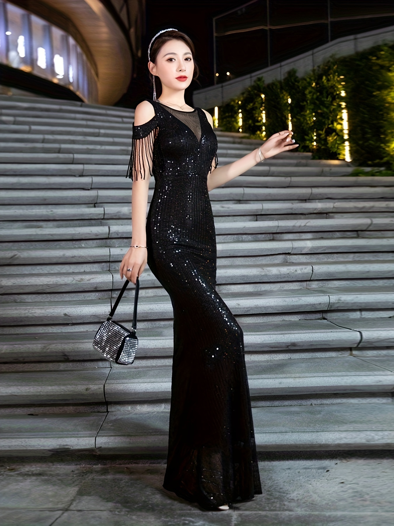 Stunning Sequined Bodycon Maxi Dress - Women's Clothing - Elegant Cold Shoulder, Mesh Splicing, Fringe Hem, Party & Banquet Perfect, Chic and Glamorous