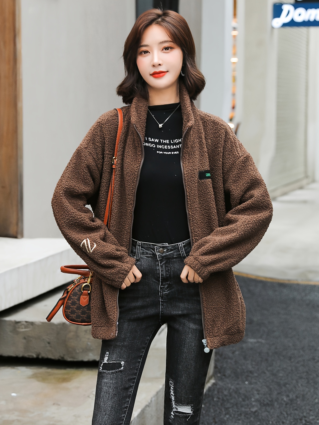 1pc Cozy Plus Size Women'S Casual Sherpa Jacket - Solid Color Polyester Knit Fabric with Slight Stretch, Stand Collar, Long Sleeve Zip-Up Top for Fall/Winter