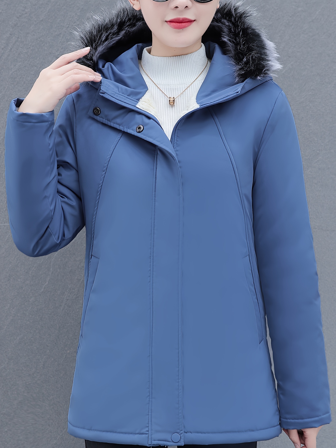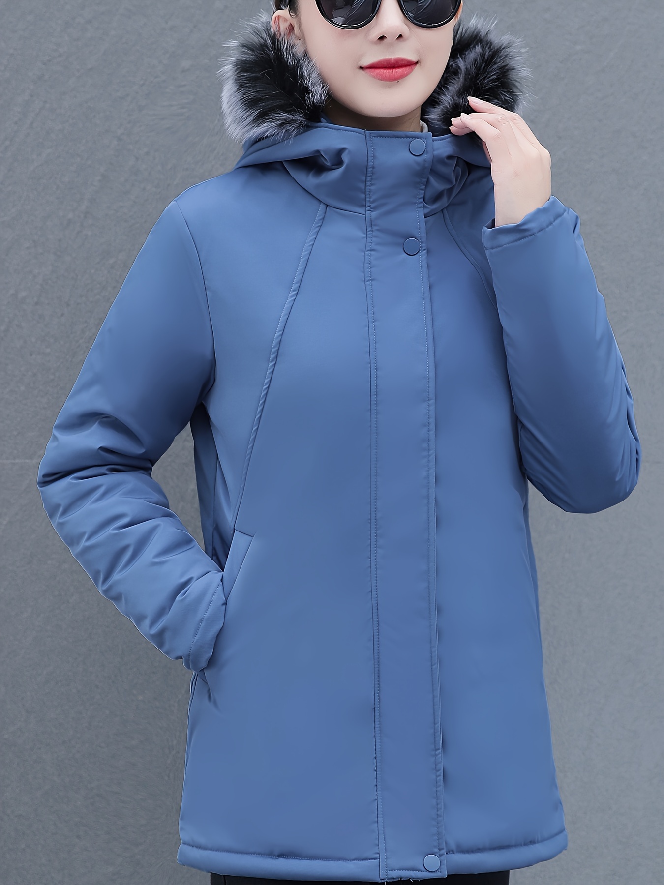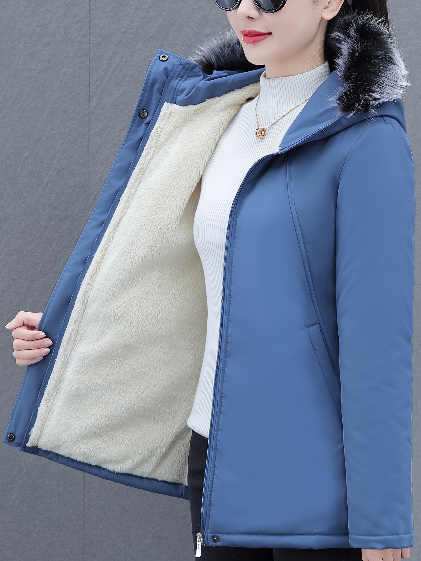Women's Elegant Winter Coat - Thick Fleece-Lined, Hooded, Zip-Up Jacket in Solid Color