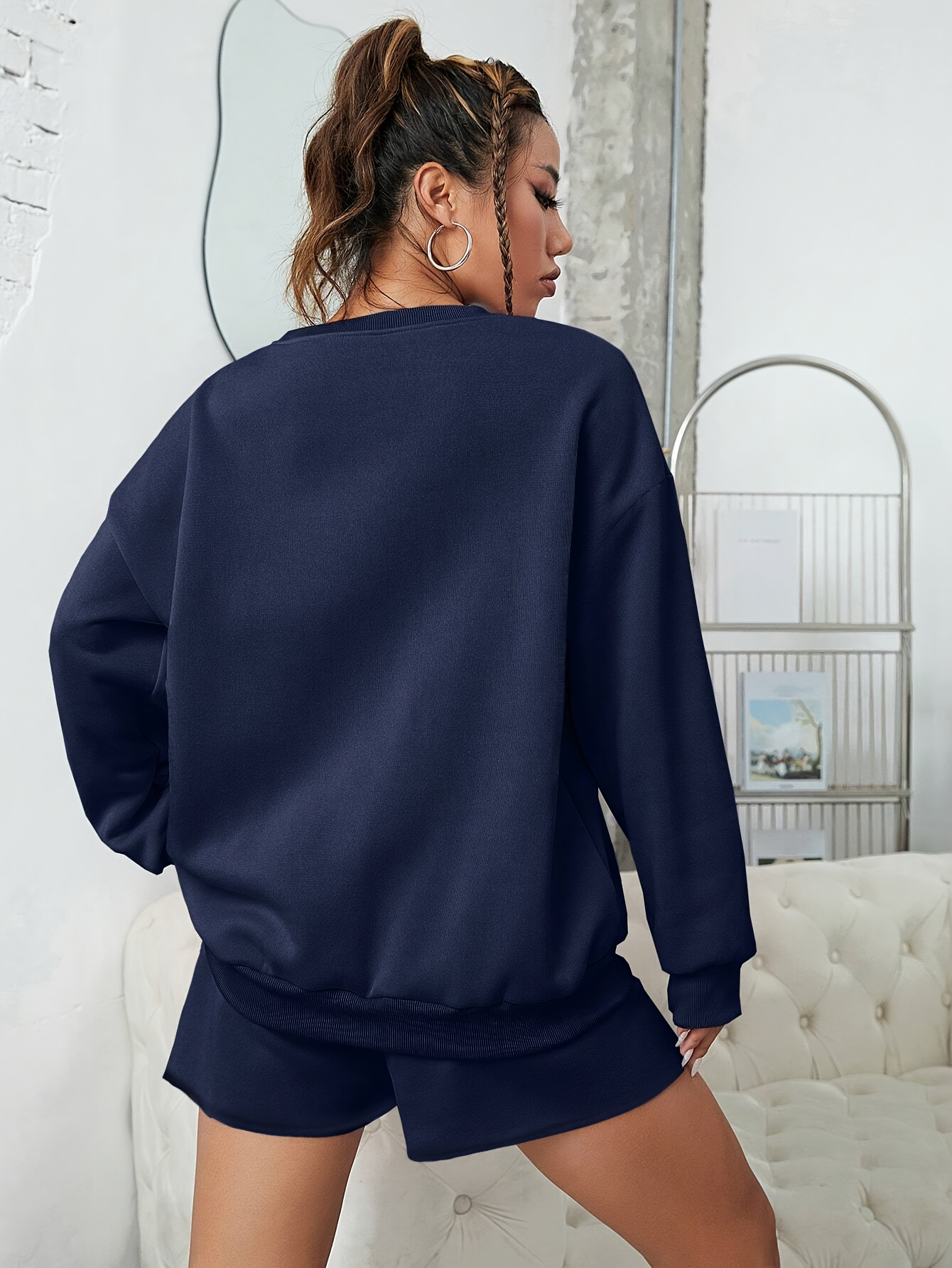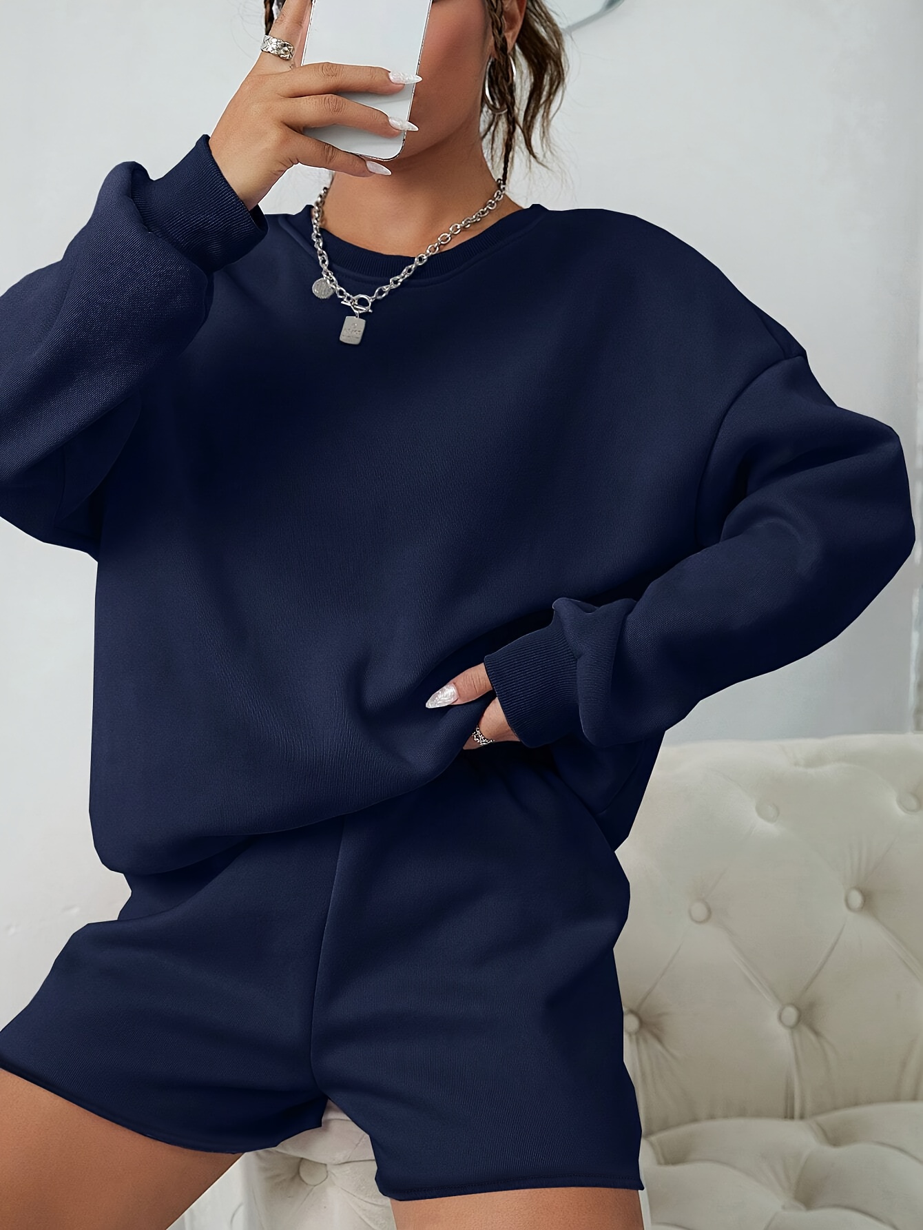 Casual Solid Color Shorts Set, Crew Neck Pullover Sweatshirt & Loose Comfy Shorts For Spring & Fall, Women's Clothing